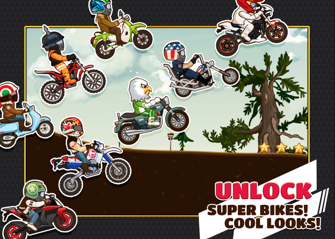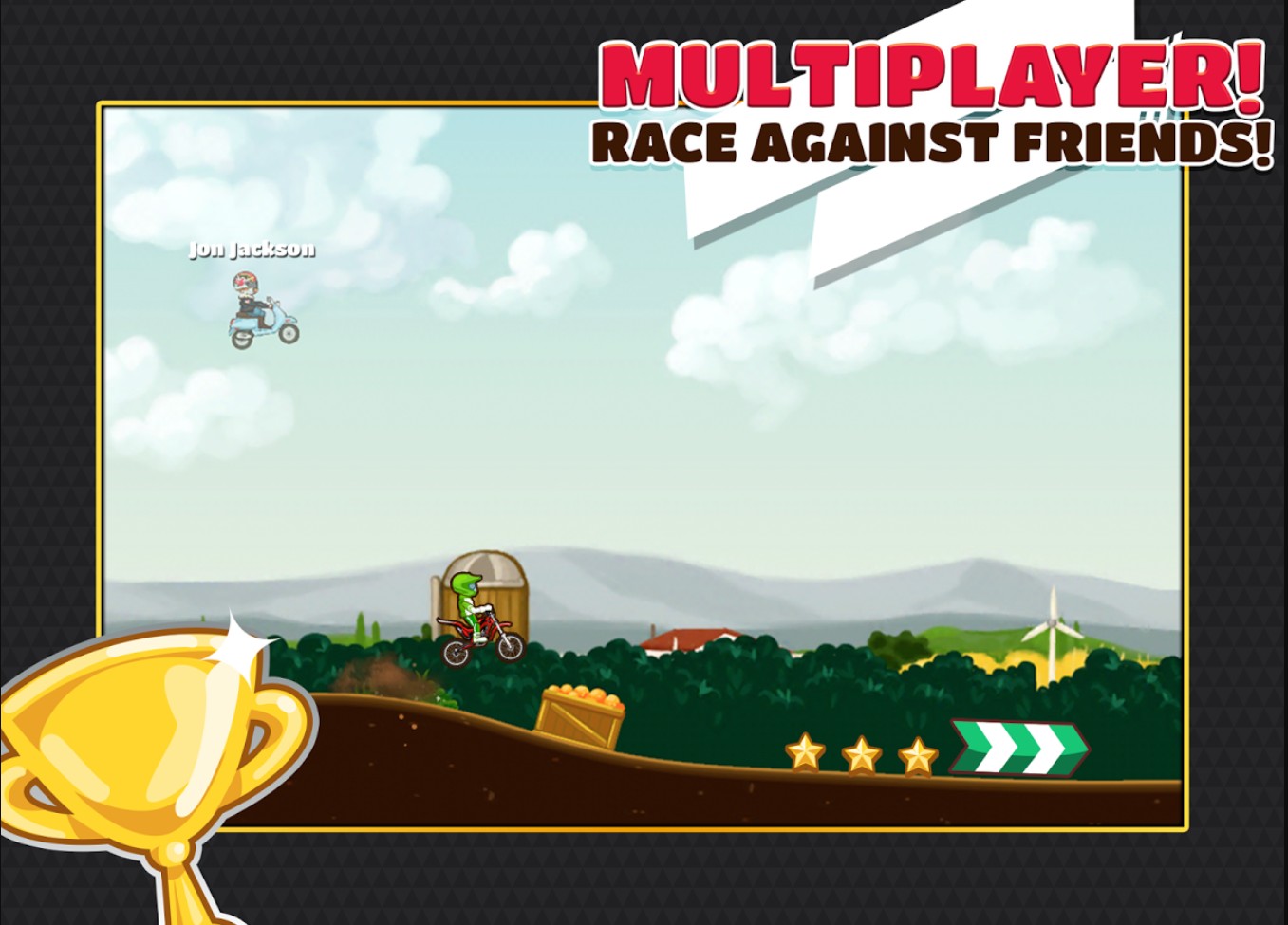 Основная цель — проехать максимально длинную дистанцию, выполняя трюки и собирая бонусы. За успешное прохождение игрок получает очки, внутриигровую валюту и возможность открывать новые модели байков. Приятная мультяшная графика, драйвовый саундтрек и лёгкое управление делают игру доступной для всех возрастов.