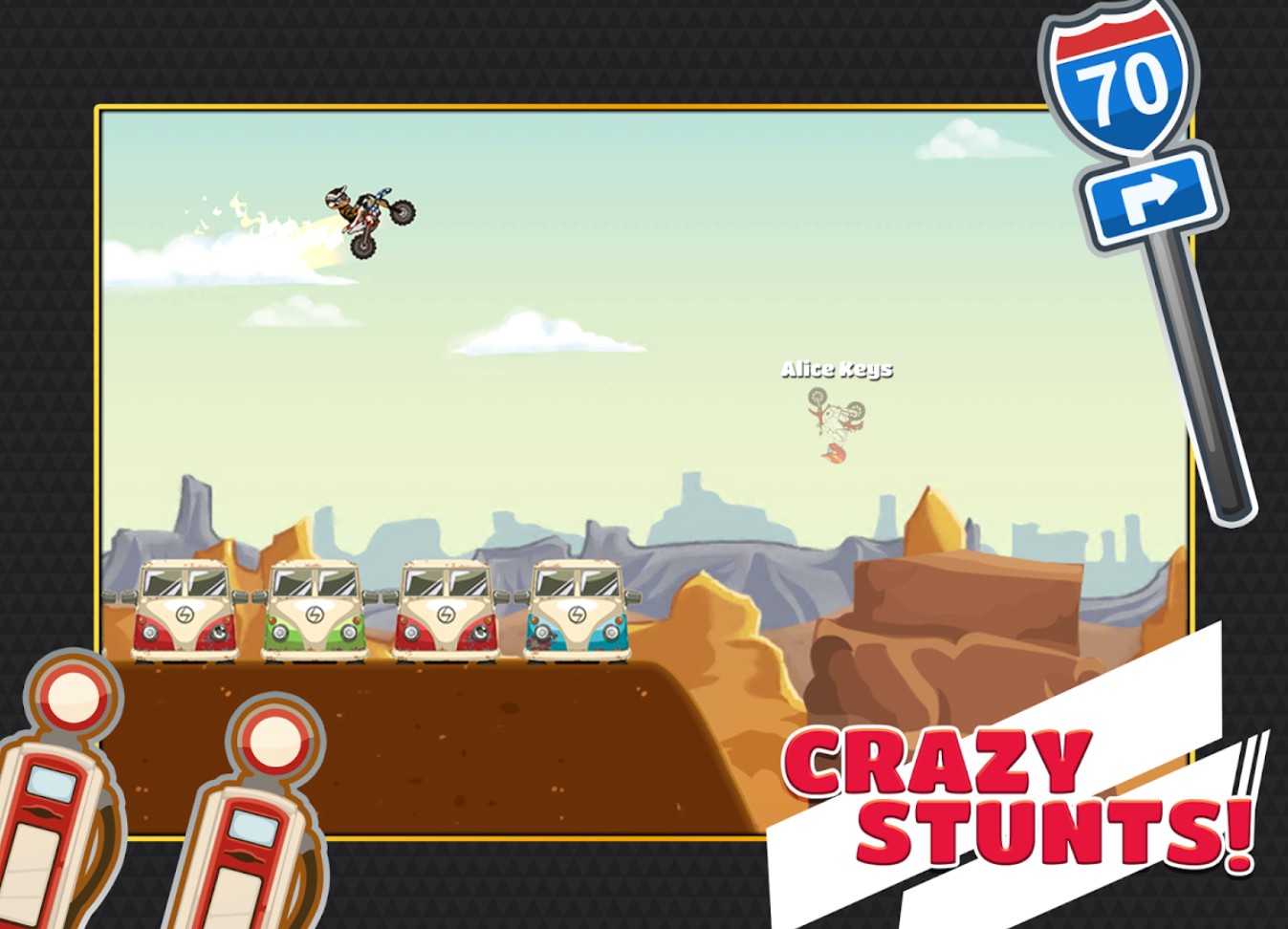 Игрок начинает с базового байка и ограниченным запасом топлива. Двигаясь по трассе, нужно собирать канистры, чтобы продлить поездку, а также монеты или специальные бонусы, позволяющие улучшать транспорт или открывать новые модели. На пути встречаются кочки, холмы и трамплины, благодаря которым можно выполнять зрелищные прыжки.